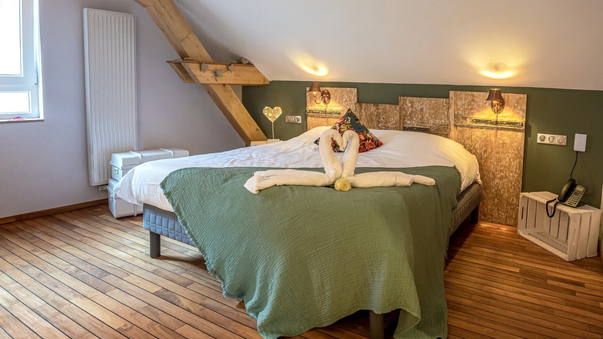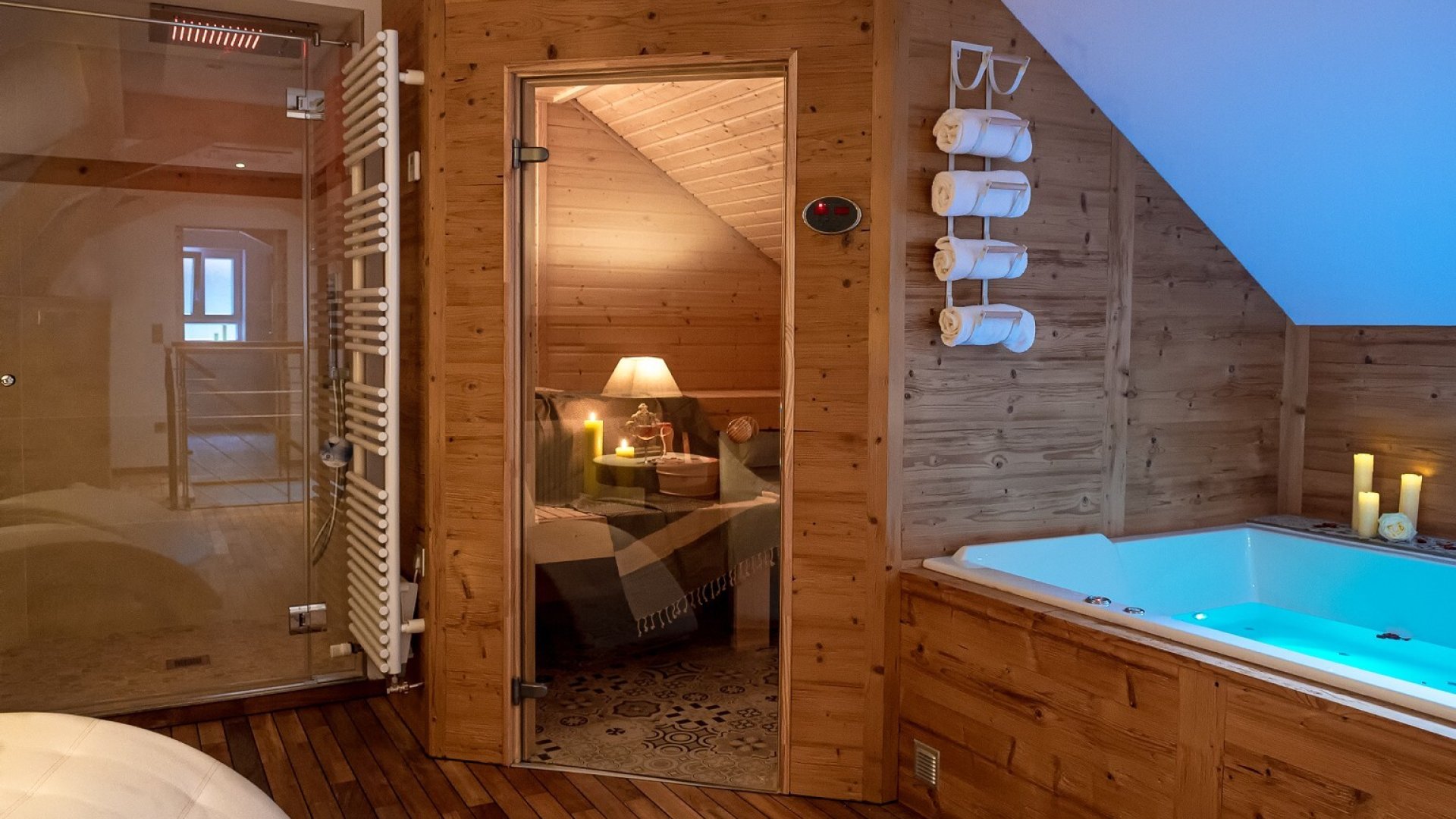 - Notre Suite Romantique : Un duplex cosy avec espace bien-être privatif, balnéo, sauna et douche sensorielle, véritable invitation à la détente à deux.